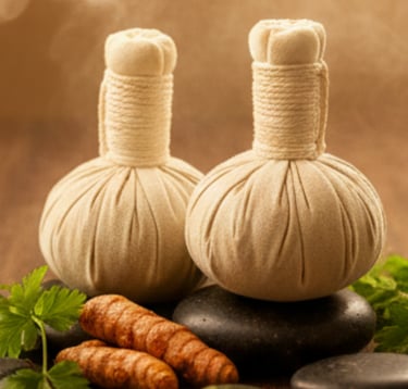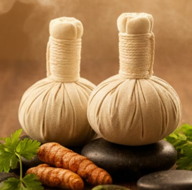 Kizhi Heated herbal poultices pressed over stiff areas to help release tension and heaviness.